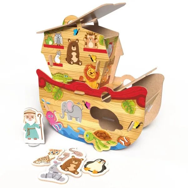 Incentive a criança a identificar e encaixar os animais corretamente na Arca de Noé.