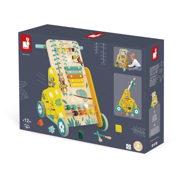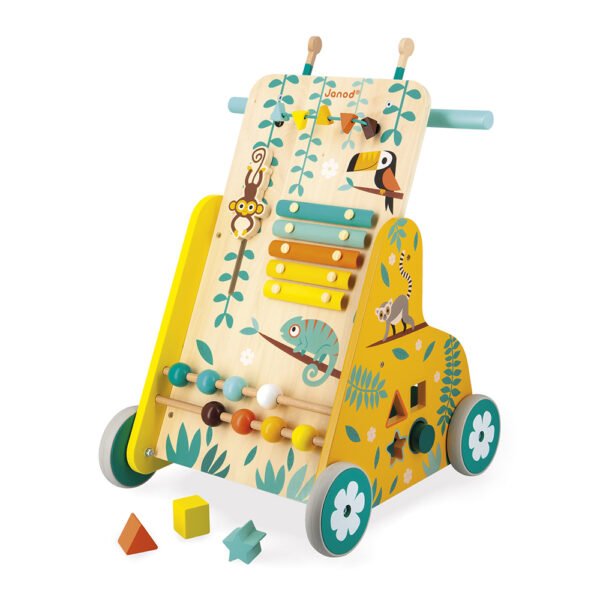 Vamos descobrir o coração da selva tropical! Com este carrinho multi-atividades em madeira, as crianças a partir dos 12 meses vão divertir-se por horas! Ideal para acompanhar o bebê enquanto ele aprende a andar, este colorido carrinho de madeira se tornará o companheiro ideal para suas primeiras aventuras. Este carrinho é silencioso graças ao revestimento de borracha nas rodas. 6 atividades estão disponíveis para ainda mais descobertas e jogos: ábacos, uma caixa de formas, um adorável macaco deslizante, um labirinto, contas deslizantes e um xilofone! Para estimular o bebê e apoiá-lo em seu desenvolvimento, desde 1 ano. Práticos, os dois bastões de madeira para o xilofone deslizam sobre o carrinho para você não perdê-los e levá-los para qualquer lugar! Este andador de cores vibrantes encantará toda a família! Carrinho de madeira. Tinta à base de água.