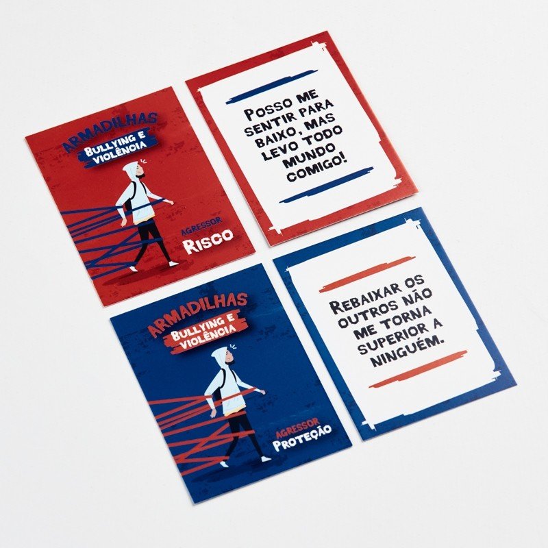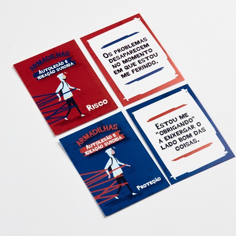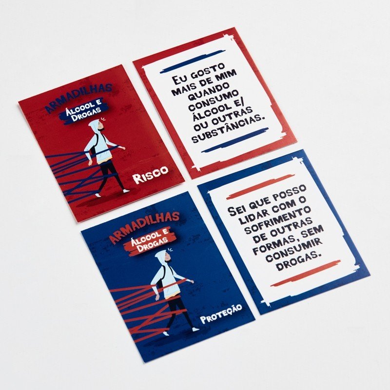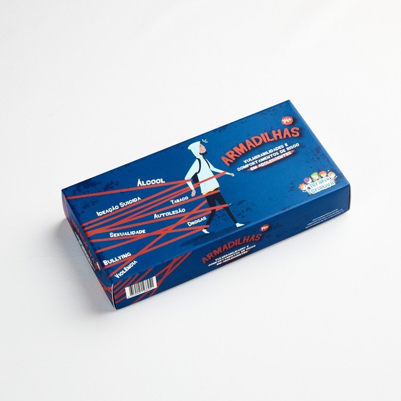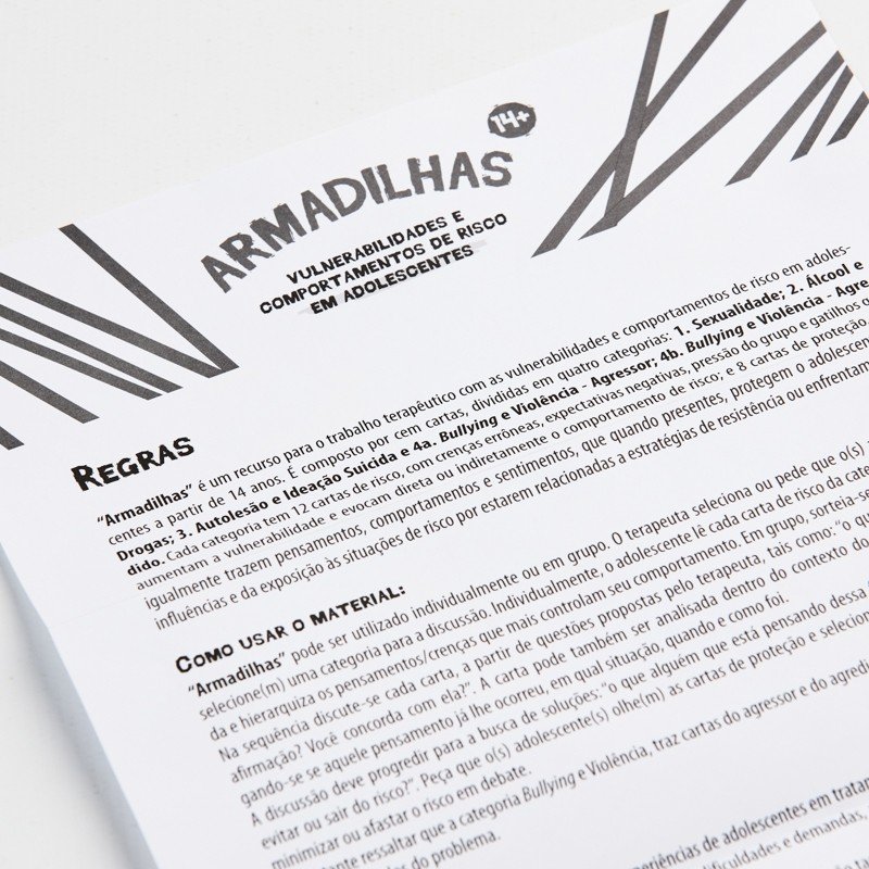 Recurso terapêutico para o trabalho com as vulnerabilidades e comportamentos de risco em adolescentes nas áreas de sexualidade, álcool e drogas; autolesão e ideação suicida e Bullying. Armadilhas é composto por cartas de risco, com crenças errôneas, expectativas negativas, pressão do grupo e gatilhos que aumentam a vulnerabilidade e o comportamento de risco; e cartas de proteção, que igualmente trazem pensamentos, comportamentos e sentimentos, que protegem o adolescente das influências e da exposição às situações de risco.