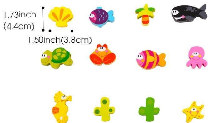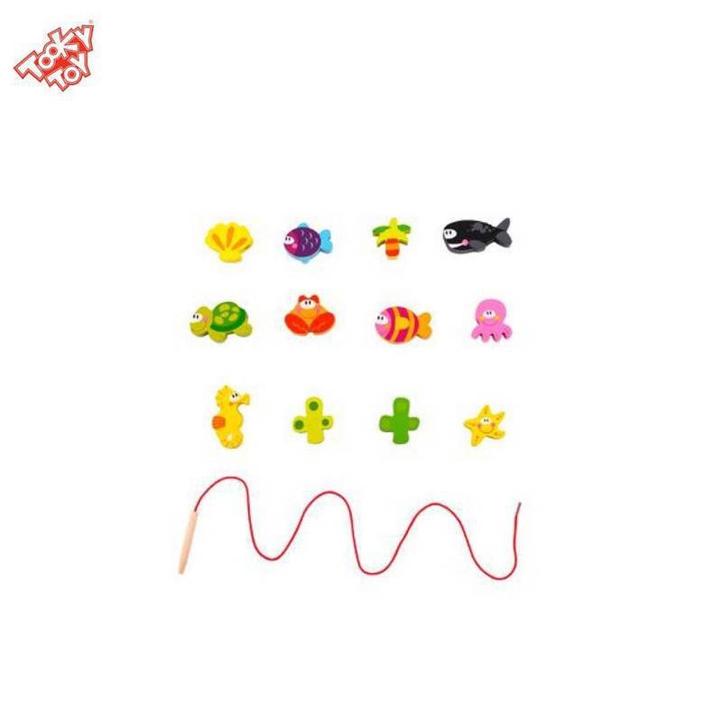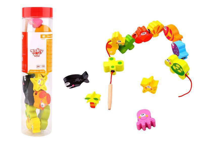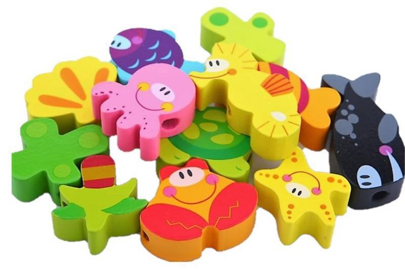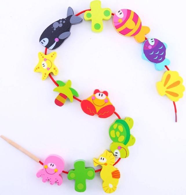 As crianças terão horas de diversão passando o cordão pelo buraco dos 12 blocos de animais marinhos.