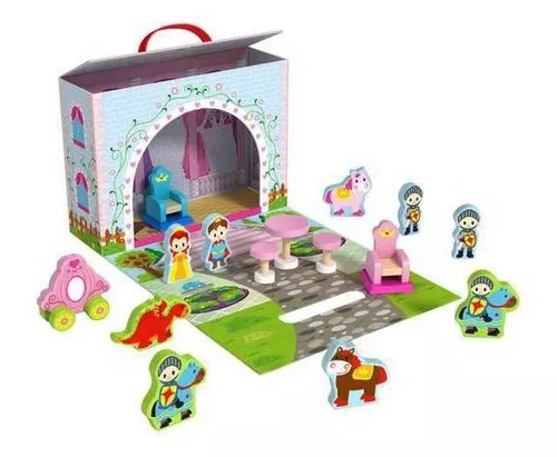 Quando aberta, forma um lindo castelo, acompanhada de mais 16 peças para compor o cenário: princesa, cavaleiros, cavalos, uma carruagem e muito mais.