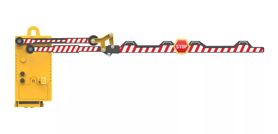 O mecanismo de junção levanta a extremidade externa da barreira quando a extremidade interna abaixa, e abaixa a extremidade externa da barreira quando a extremidade interna sobe.