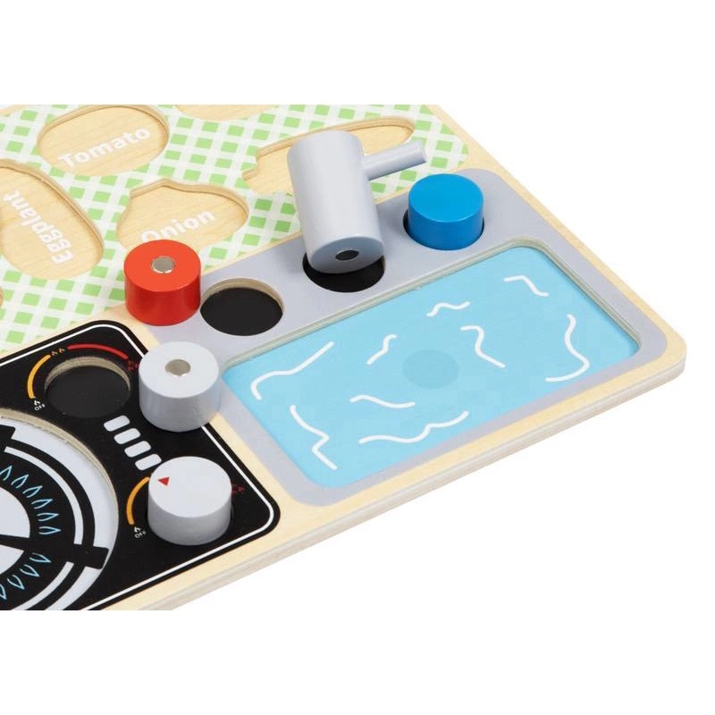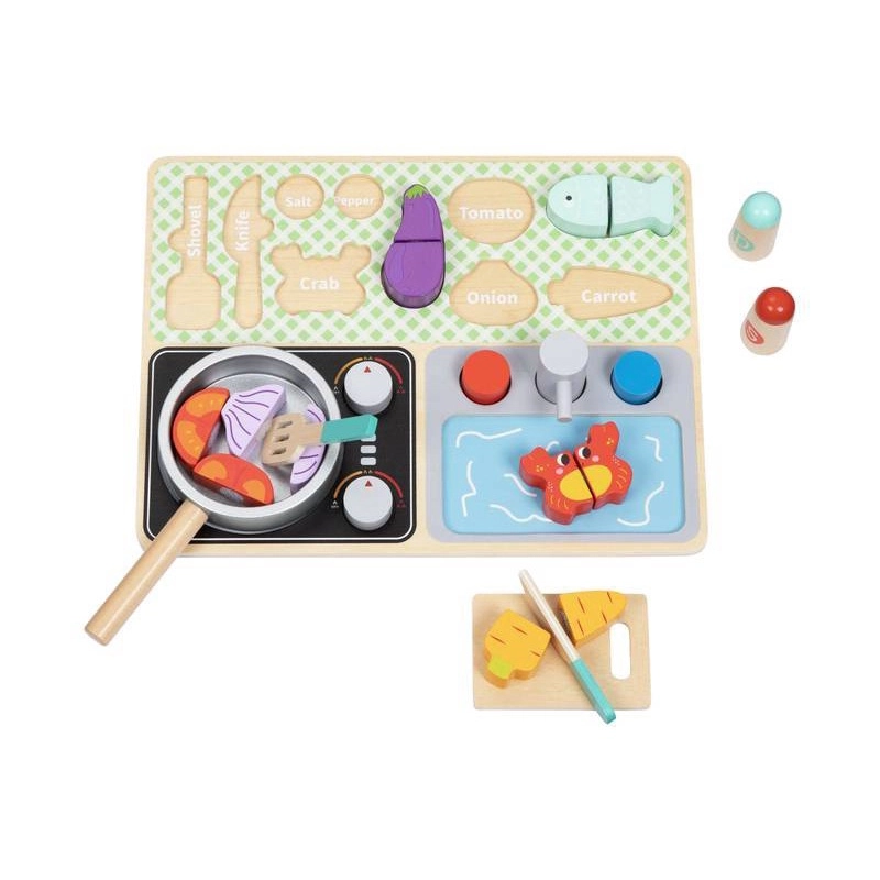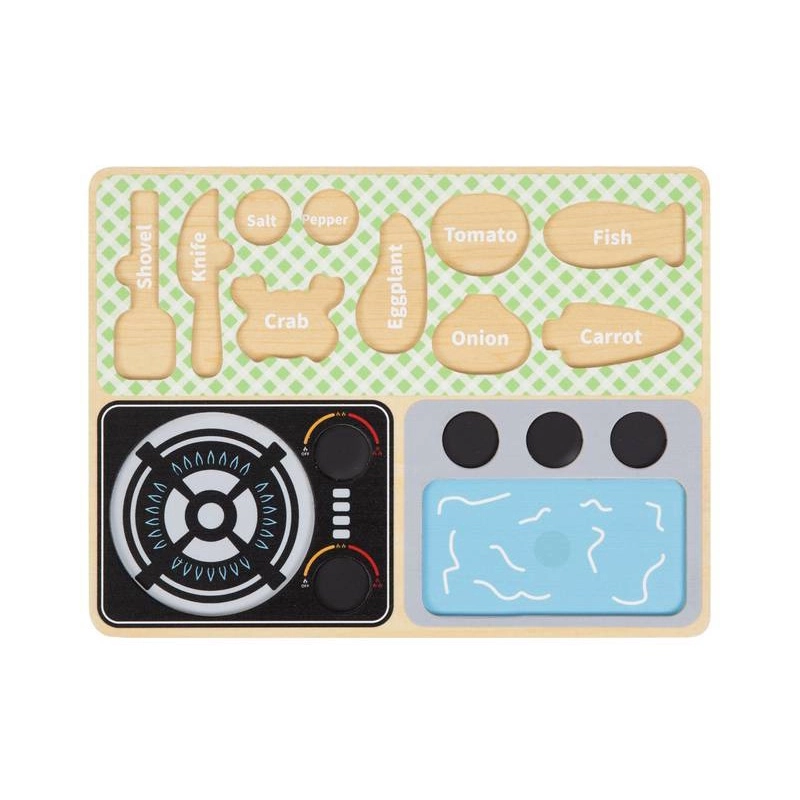 Acessórios de cozinha para brincar: Nossos quebra-cabeças de madeira vêm com comida para brincar e acessórios de cozinha, tornando-os um ótimo complemento para qualquer conjunto de cozinha para brincar.