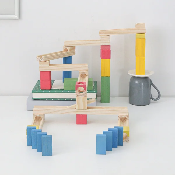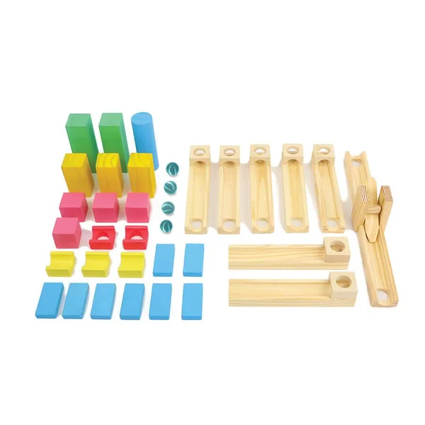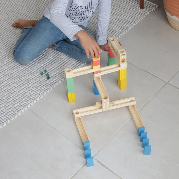 A brincadeira consiste em criar variados circuitos para as bolinhas correrem com o efeito da gravidade, juntando as canaletas, apoios e peças de passagem!