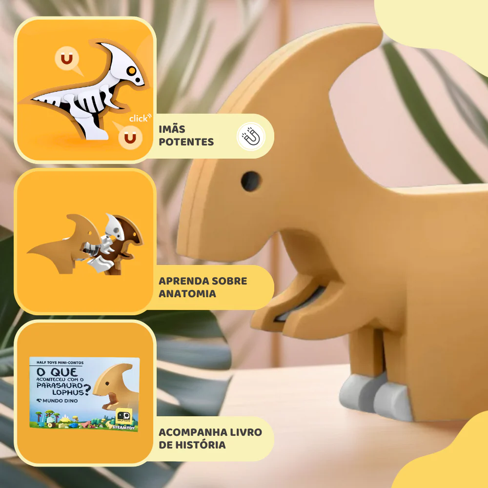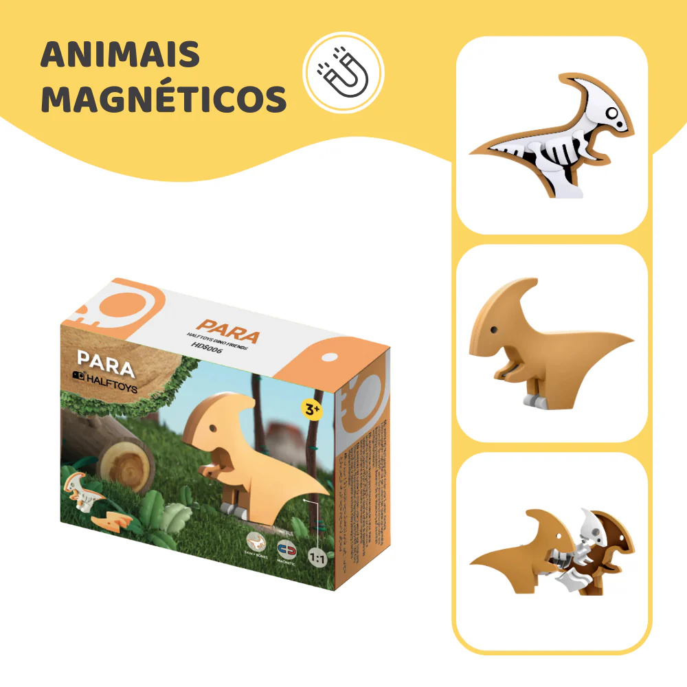 Descubra o mundo fascinante dos animais com Half Toys, A brincadeira começa com a montagem do esqueleto do animal, proporcionando uma introdução divertida à anatomia básica. Depois a criança monta a parte externa do animal com perfeição, graças às peças magnéticas de alta qualidade.