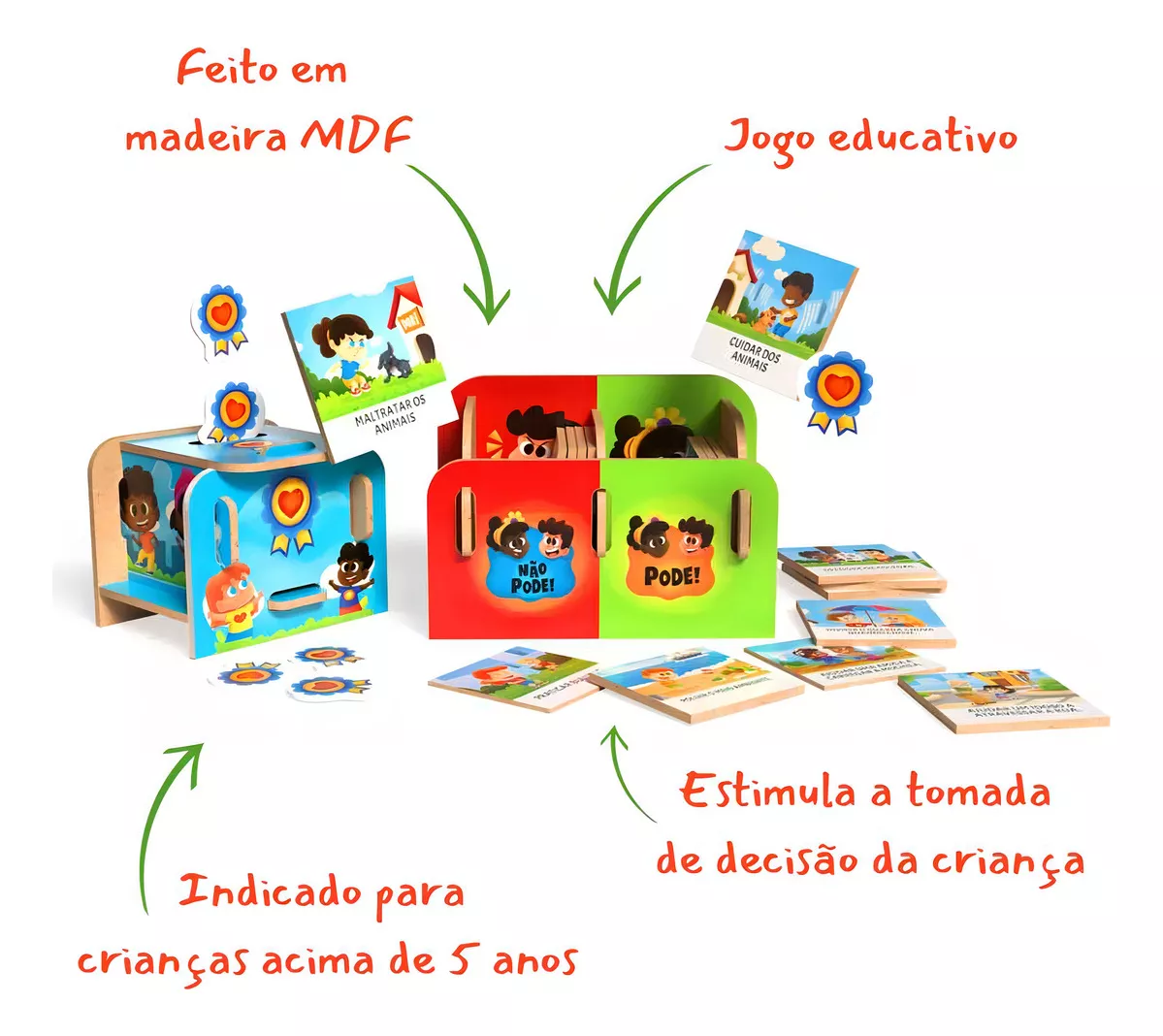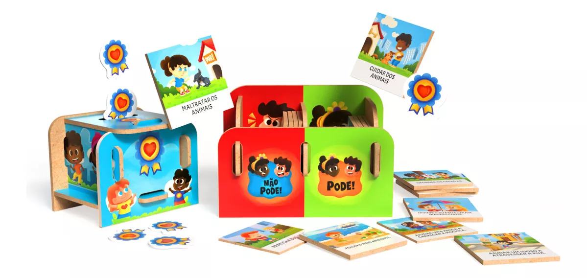 Dentre tantos desafios que existem ao criar e educar uma criança, ensiná-las o que é certo e o que é errado ficou mais fácil com o Jogo – Pode e Não Pode! São 24 plaquinhas divididas entre ações que podem ser feitas e ações que não podem ser feitas. A partir disso o jogo começa, as crianças vão escolher em qual caixa colocar as plaquinhas, e a cada vez que colocarem a plaquinha na caixa certa ganham uma medalha.