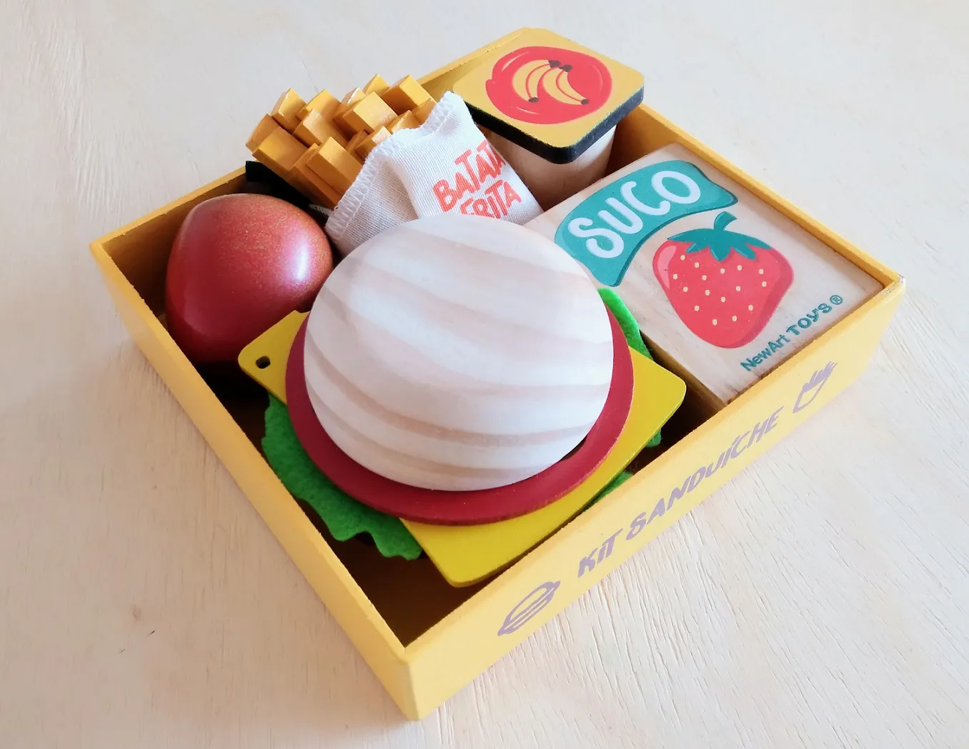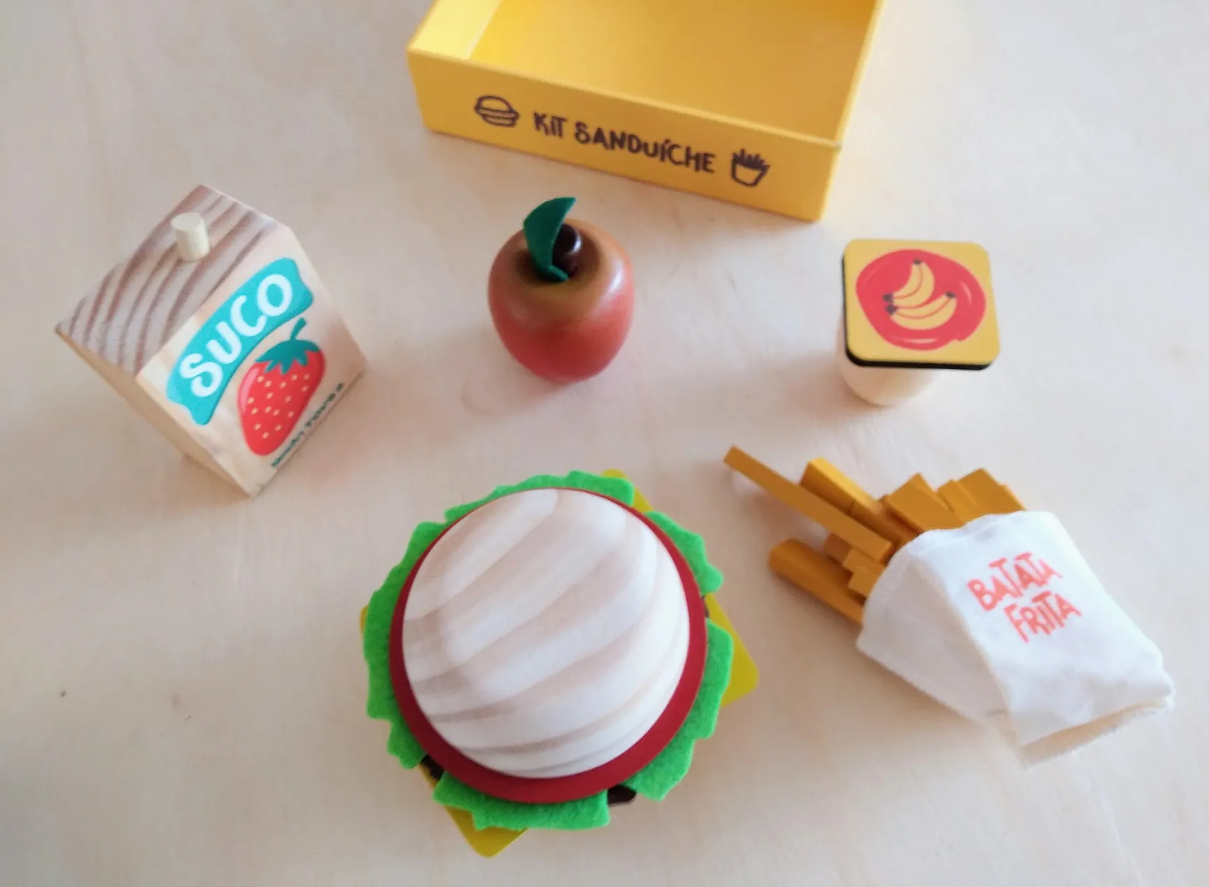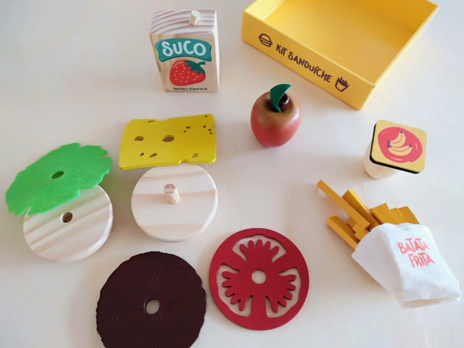 Este kit contém 11 peças* (1 bandeja, 1 suco, 1 fruta, 1 iogurte, 2 fatias de pão, 1 folha de alface, 1 fatia de queijo e 1 de tomate, 1 hambúrguer e *1 saquinho de muitas batatas fritas palito).