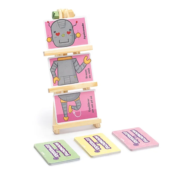 Contém: 1 cavalete de madeira, 45 cartas e 1 guia de brincadeiras.
