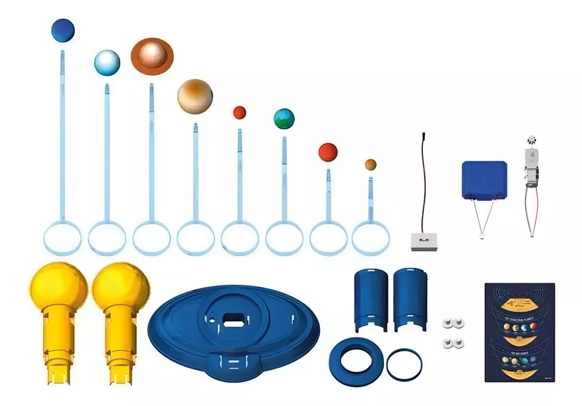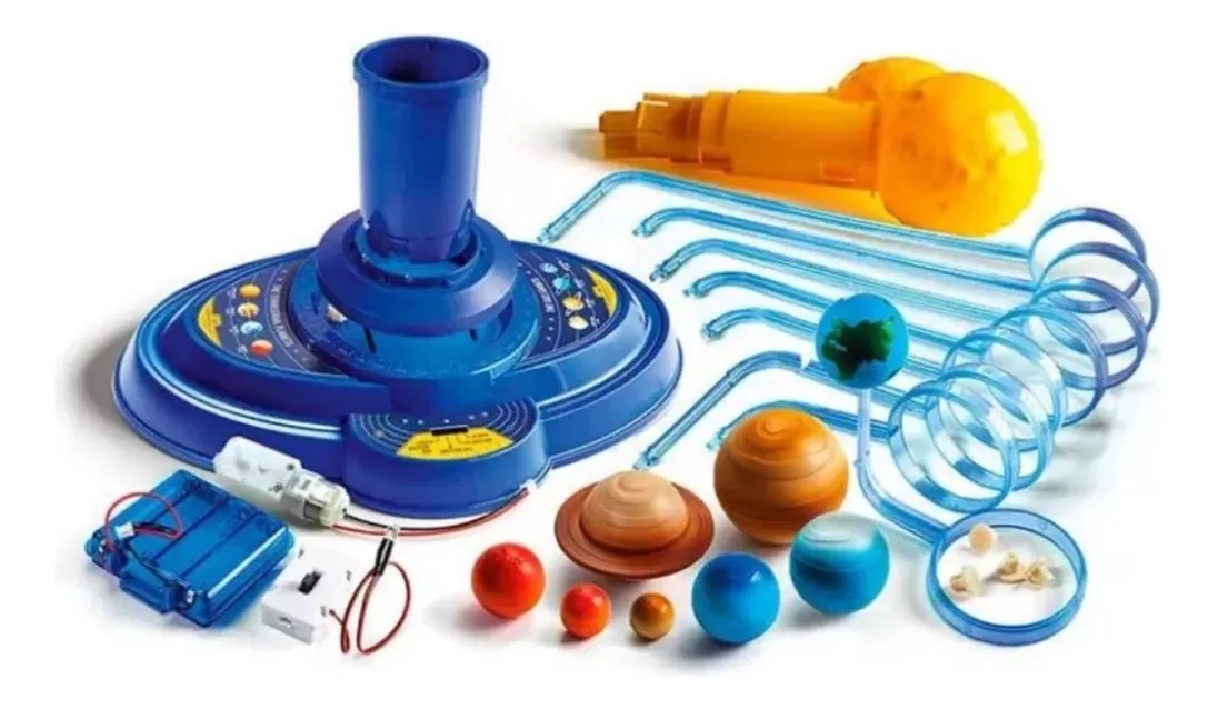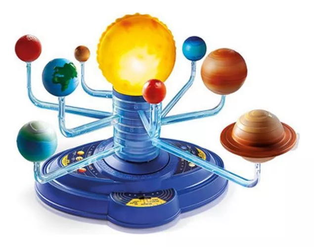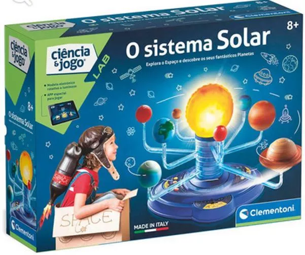 Conteúdo da Embalagem: Base, tronco, sol, braços, engrenagem, motor, compartimento de pilhas, interruptor de led, planetas, borrachas, adesivos e manual de instruções.