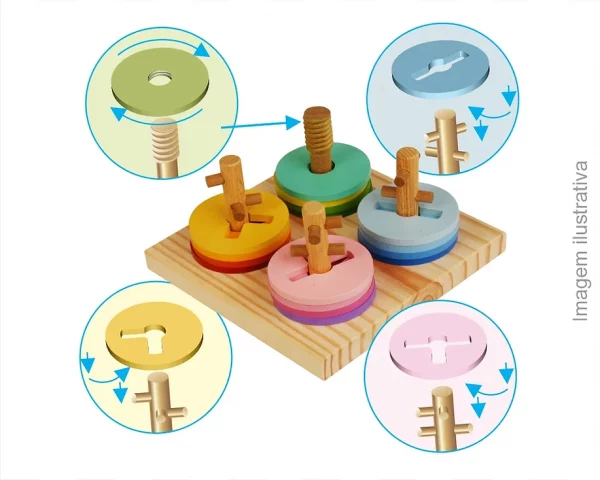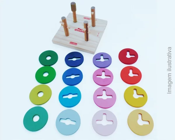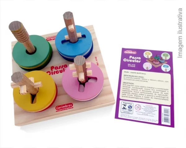 Este jogo tem como objetivo trabalhar a coordenação bi manual, coordenação motora fina (montagem e encaixe), proporcionando a descoberta através da ação exploratória. Trabalha também a amplitude espacial, ordem e simbologia. Explora a intencionalidade quando da passagem dos círculos.