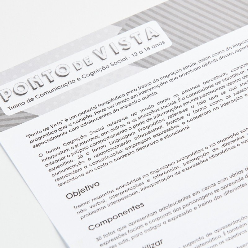 Um ponto de vista é sempre a vista de um ponto. Enxergar vários pontos ao mesmo tempo por diferentes perspectivas pode ser um objetivo terapêutico. Ponto de Vista treina cognição social, empatia e linguagem pragmática. Auxilia também no ensino da comunicação verbal e não verbal, interpretações e inferências, resolução de problemas interpessoais, interpretação de expressões idiomáticas e sarcasmo. Excelente apoio no atendimento as demandas da adolescência presentes nos casos TEA.