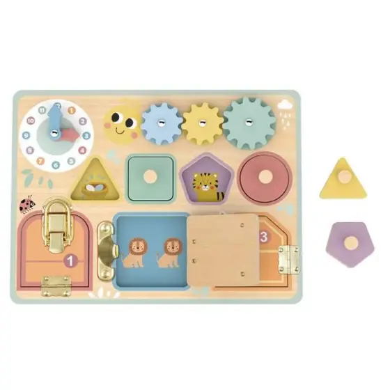 O Quadro de Atividades instiga a curiosidade da criança e desafia usa habilidade motora com fechos reais, Desenvolva a coordenação motora fina, raciocínio lógico, concentração e curiosidade.