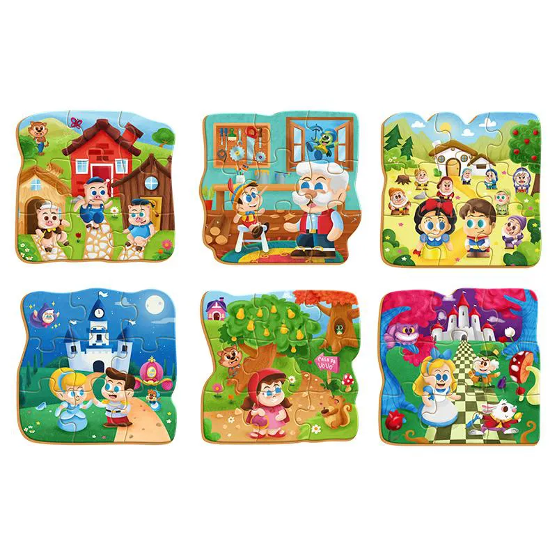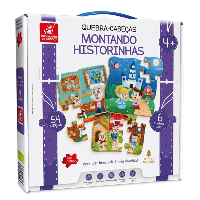 Montando Historinhas são seis quebra-cabeças de 9 peças, cada um com um conto de fada clássico para montar e se divertir.