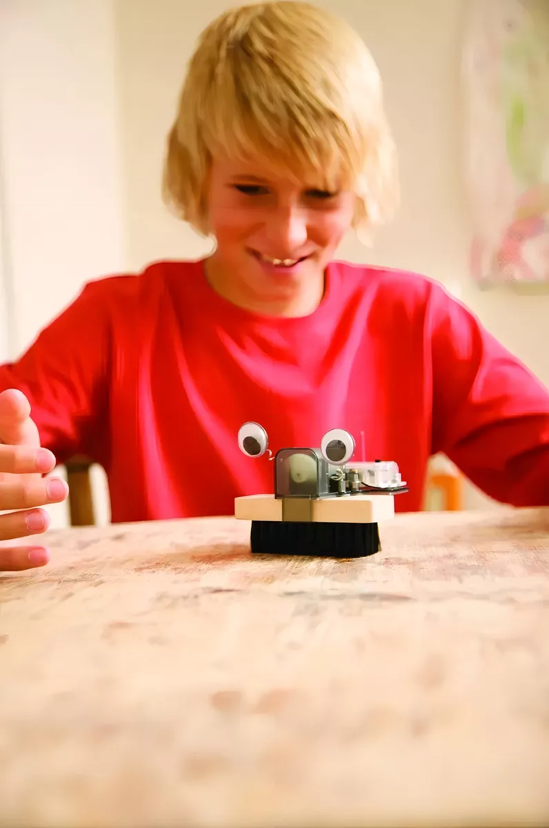 O Robô Escova 4M é um projeto robótico para montagem. Em sua caixa vem as instruções para a criança montar de forma manual. Depois de montado é só diversão e limpeza!
